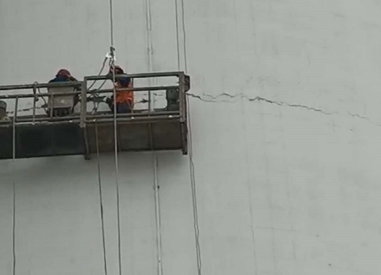 图:混凝土水泥库出现裂缝,导致水泥受潮板结严重,工人正在修复。
